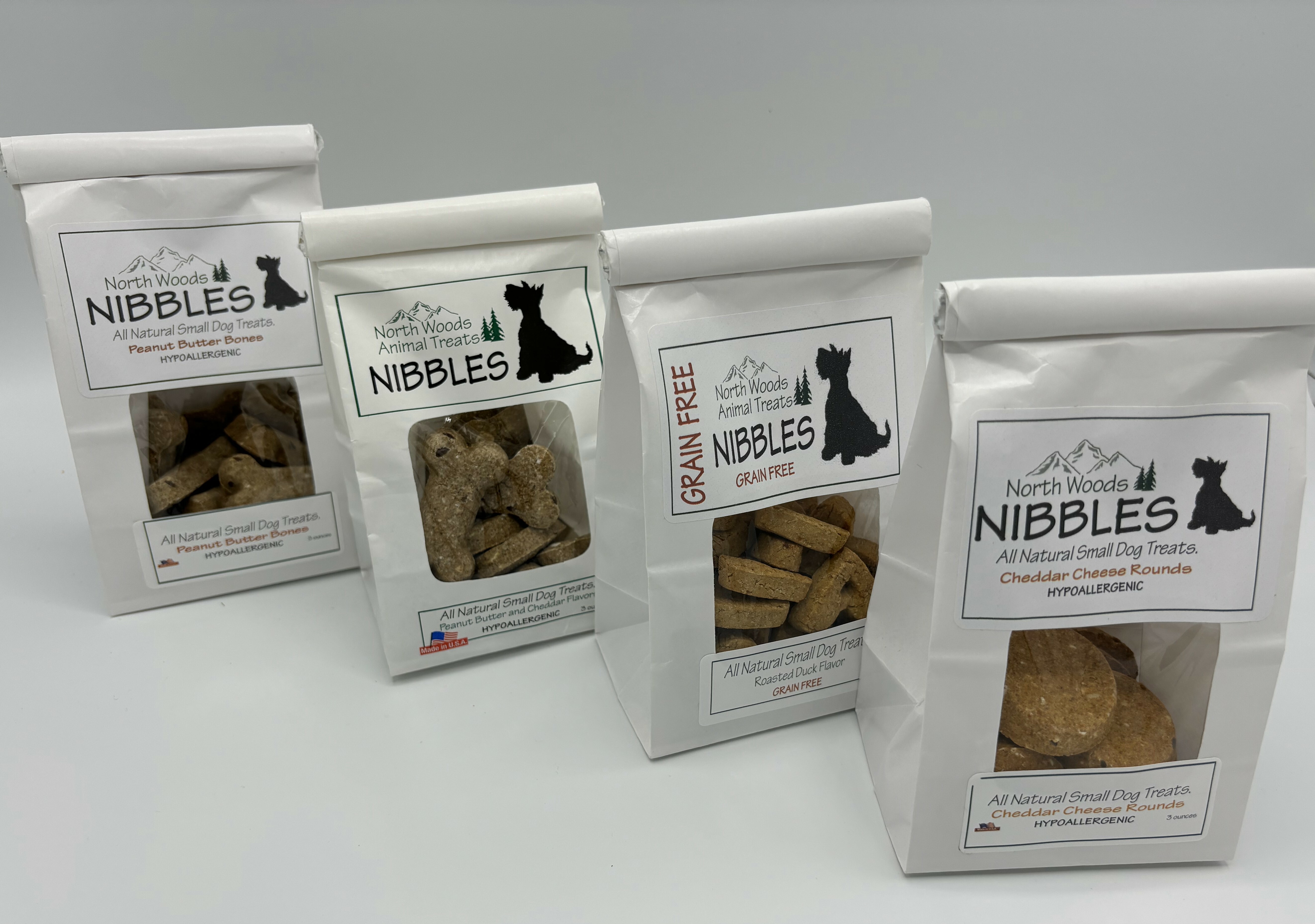 Add to Cart Nibbles - 1 Peanut Butter Bone & 2 Cheddar Rounds - 3 Nibbles/Bag Total MSRP: Was: Now: $1.99 Hypoallergenic, all natural small dog treats contain no wheat, corn or soy. 1 Peanut Butter Bon…